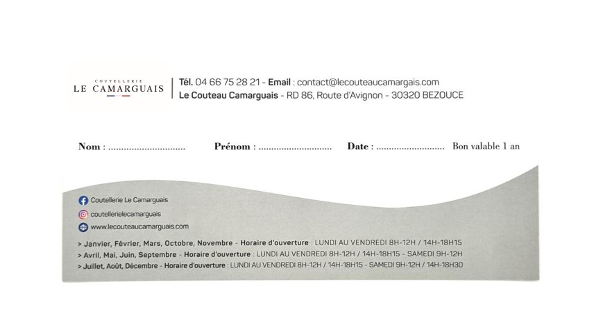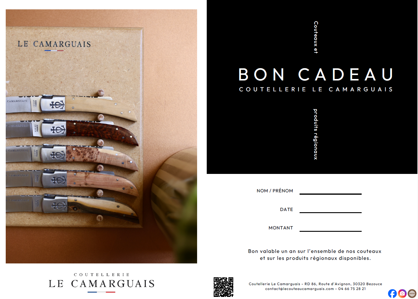 Faites plaisir à vos proches avec le bon cadeau de 150 € de la coutellerie Le Camarguais. Que ce soit pour un anniversaire, la fête des Mères ou toute occasion spéciale, ce bon permet de choisir parmi nos couteaux artisanaux et nos autres produits régionaux. De plus, il offre une expérience unique et authentique.