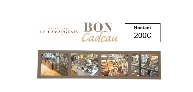 Faites plaisir à vos proches avec le bon cadeau de 200 € de la coutellerie Le Camarguais. Que ce soit pour un anniversaire, la fête des Mères ou toute occasion spéciale, ce bon permet de choisir parmi nos couteaux artisanaux et nos autres produits régionaux. De plus, il offre une expérience unique et authentique.