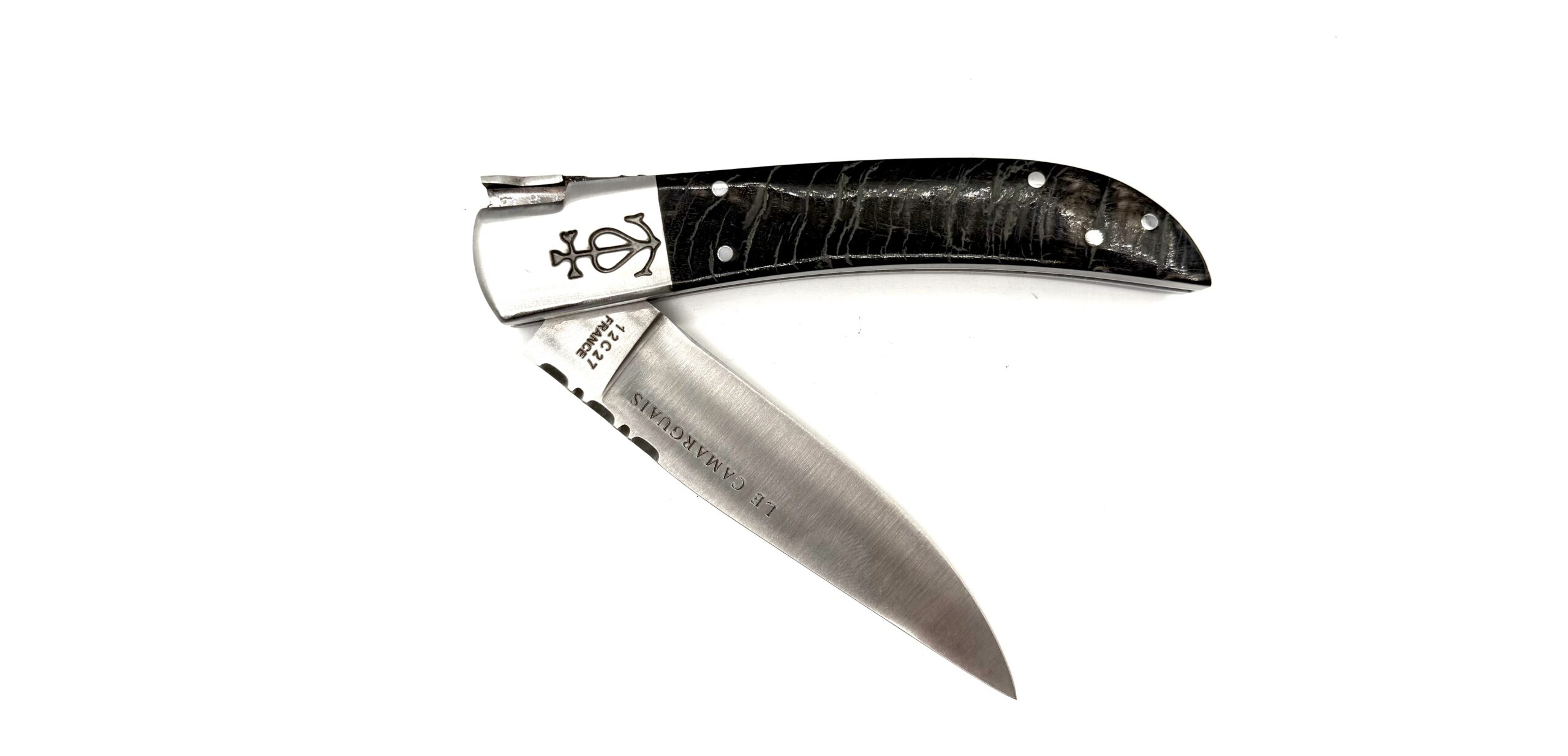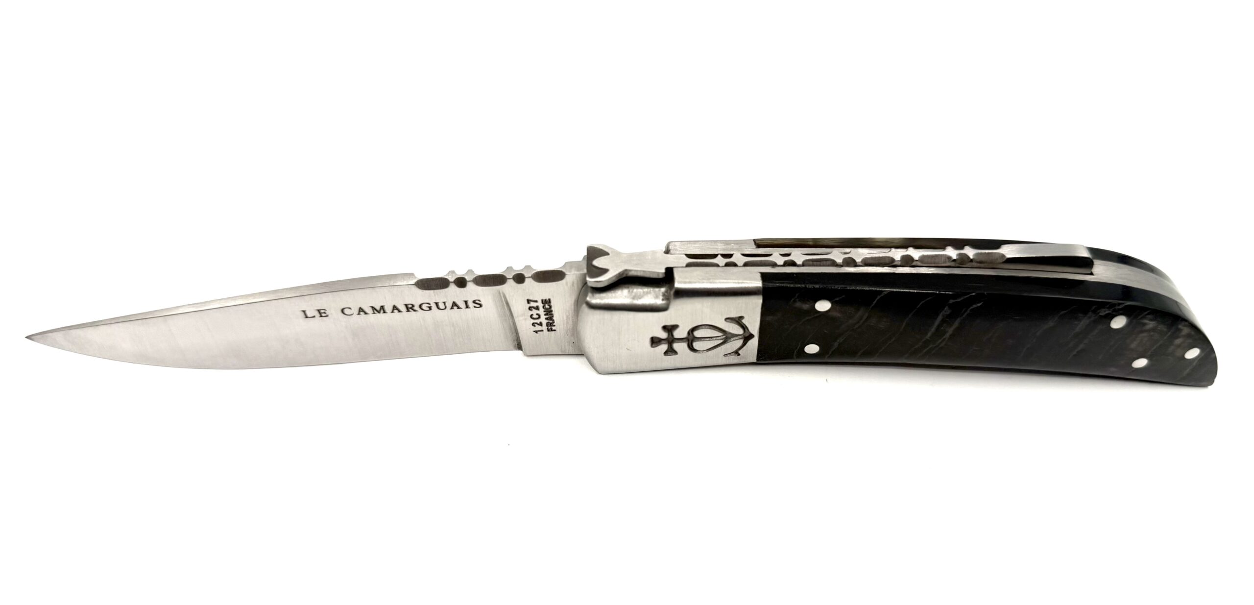 Fabriqué dans les règles de l’art, le Camarguais forgé bélier foncé n°12 – est entièrement monté dans notre atelier. Le trident, l’outil indispensable des Gardians pour travailler avec les toros, est forgé dans la masse. Notre technique d’émouture offre à la lame un tranchant parfait.