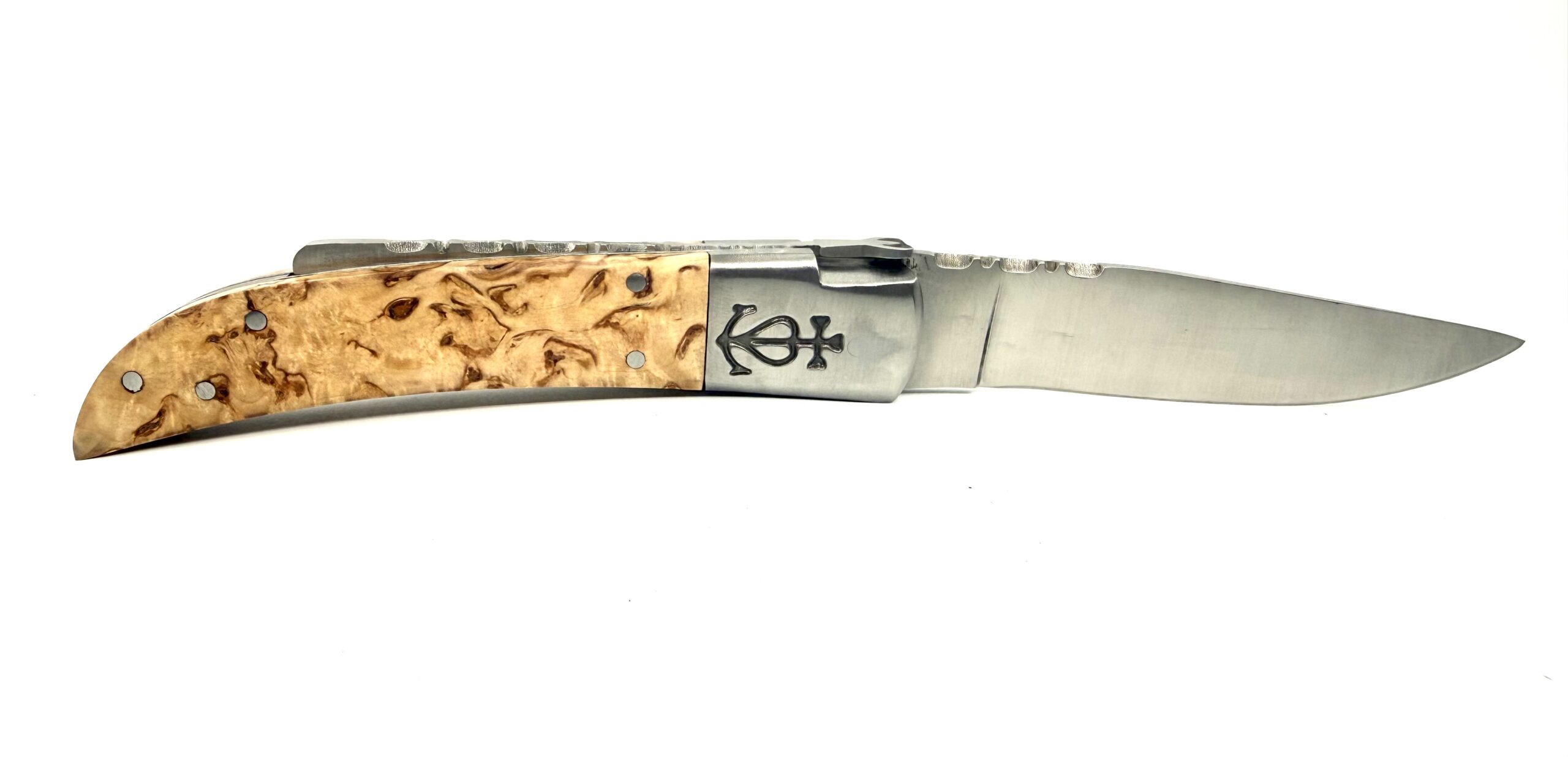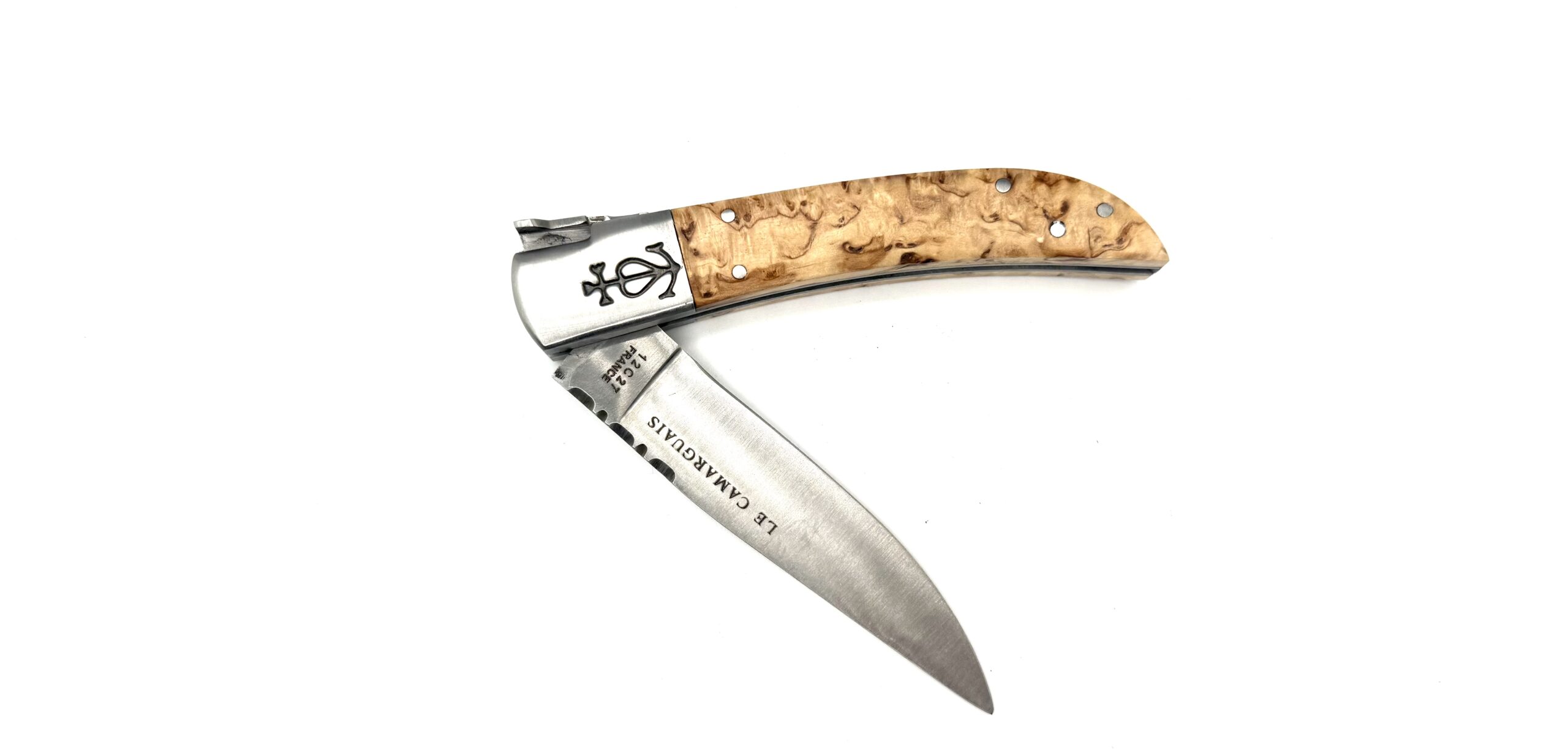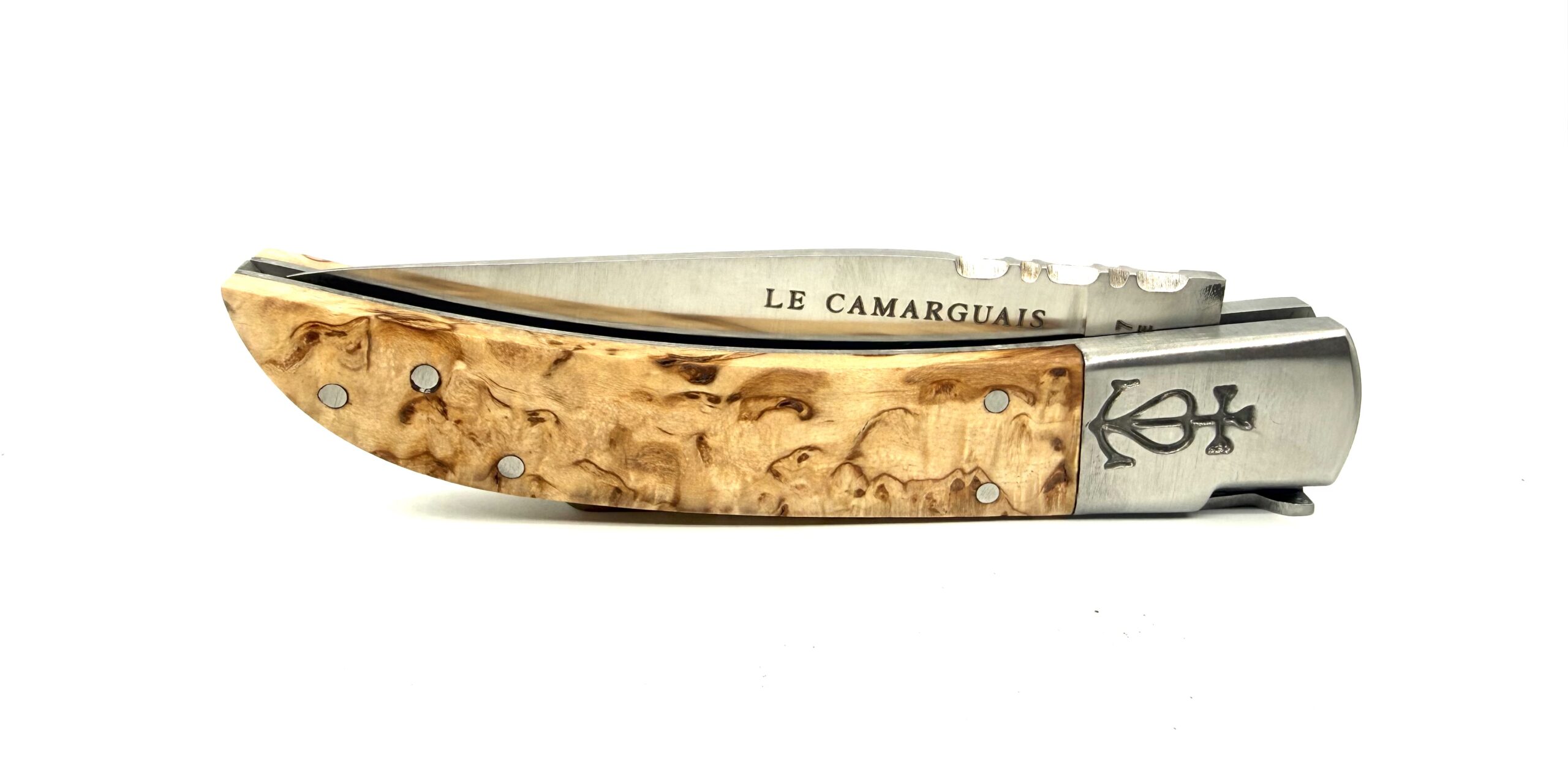Son manche est façonné dans un bois de bouleau, une essence claire et lumineuse, appréciée pour ses nervures douces, ses reflets légèrement dorés et son grain fin. Le bouleau offre un toucher agréable et une belle stabilité dans le temps. C’est un bois simple et naturel, qui reflète l’esprit même du Camarguais : authentique, utile, sans artifice.