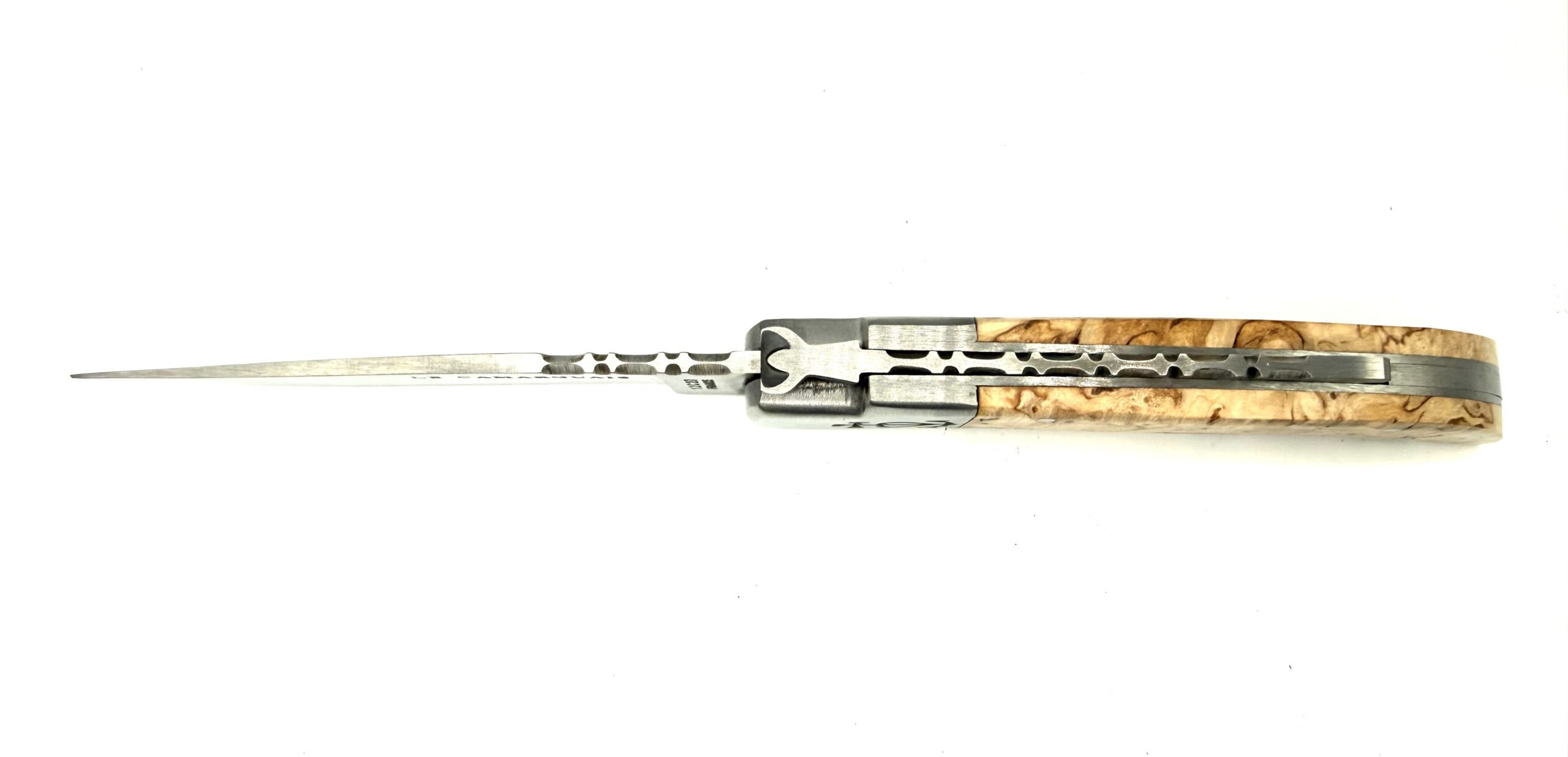 Ce couteau Le Camarguais forgé n°12 – Bouleau pliant rend hommage aux formes traditionnelles et à l’authenticité des couteaux régionaux. Fabriqué artisanalement dans notre atelier à Bezouce dans le sud de la France entre Nîmes et le Pont du Gard, il allie lignes épurées, solidité et sobriété, pour un usage quotidien élégant et fiable. Pliant, cran de sécurité qui n’affaiblit pas la lame lors de sa fermeture…