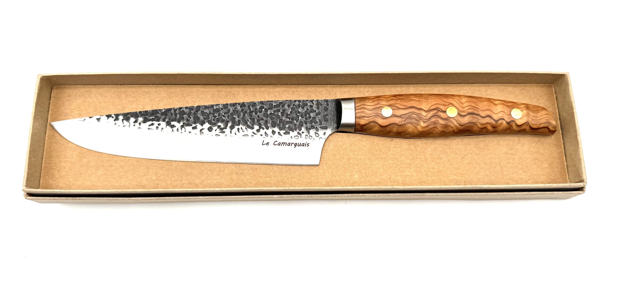 Le Camarguais à découper bois d’Olivier est un couteau de cuisine haut de gamme, conçu pour allier esthétique rustique et efficacité professionnelle. Il est doté d’une lame forgée, laissée brute sur le dos pour conserver l’empreinte du marteau et polie au niveau de l’affûtage pour une coupe nette et précise. Son manche en bois d’olivier, aux veines chaudes et contrastées, offre une prise en main confortable et naturelle.