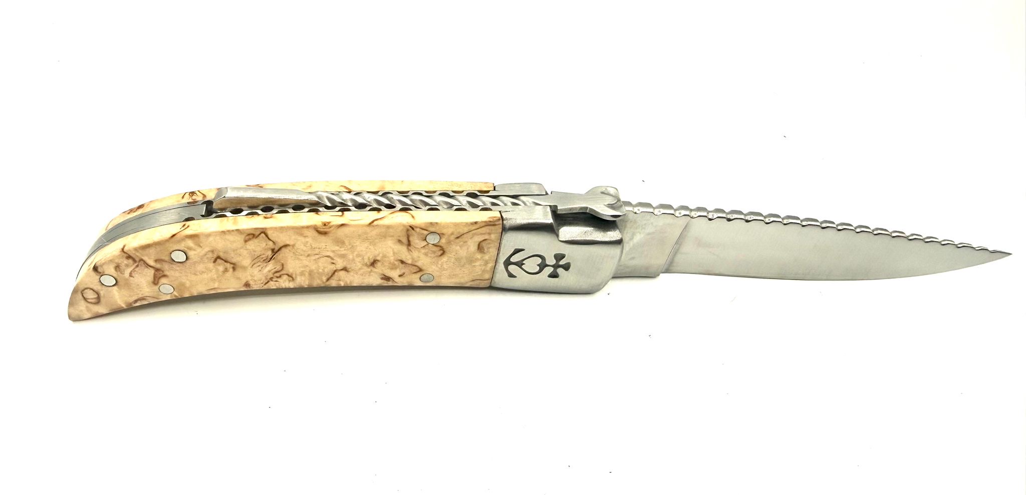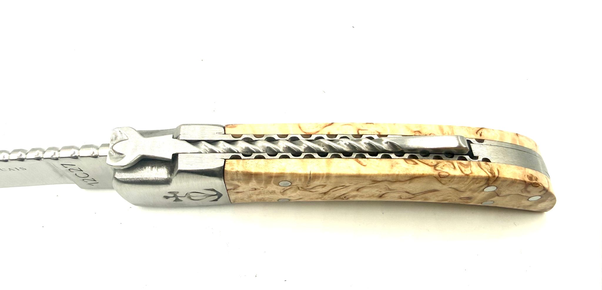 Ensuite, ce modèle se distingue grâce à son ciselage artisanal. Pour cela, le coutelier travaille chaque élément à la main à la lime triangulaire. De cette façon, il décore les platines, le ressort, le levier et la lame avec de petits motifs réguliers.