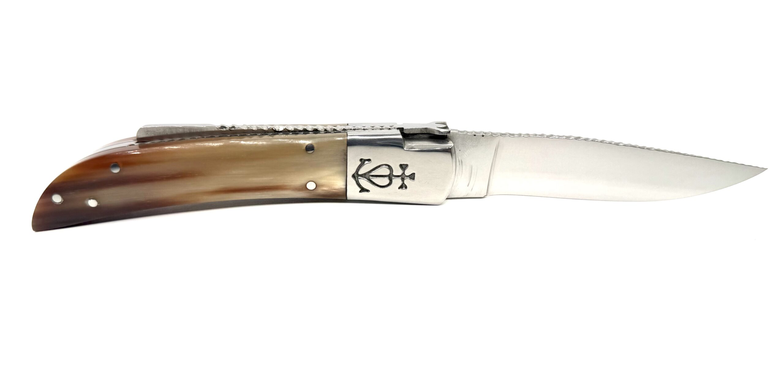 Ce modèle est un ciselé main, orné de motifs décoratifs réalisés avec précision à la lime triangle. Chaque dessin est gravé sur le dos du ressort, la bascule, les platines et jusqu’au dessus de la lame, témoignant d’un travail artisanal soigné et d’un grand sens du détail.